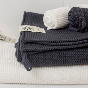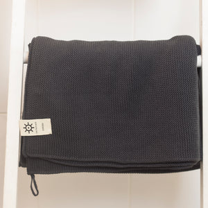 a fabulous bath towel knitted from organic eco cotton, in a deep charcoal colour. the iris hantverk organic cotton is beautifully soft and pliable with the knitted textured providing a great exfoliation. a large, lovely bath towel.