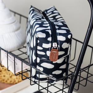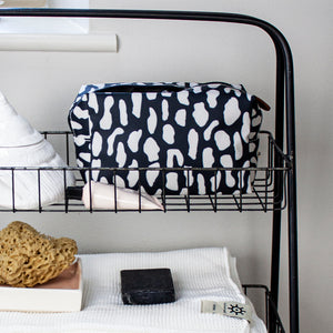 a roomy box-shaped cosmetics bag, perfectly sized for a weekend away, in our unique hand-drawn black/off-white rock pool design, designed by us in our surrey studio and inspired by walks on the beach amongst the pebbles.