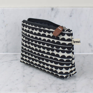 a compact make up bag that fits perfectly into handbags for everyday use, in our unique black/off-white, hand-drawn striped-scallop design.