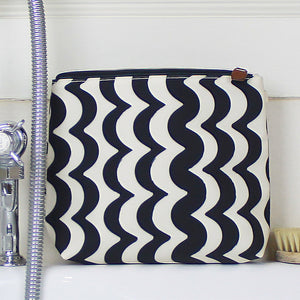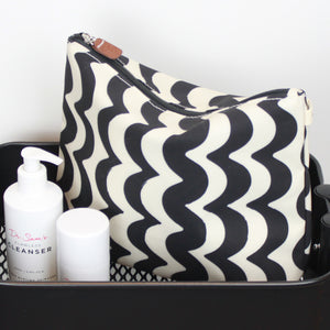 a tall, wide, wash bag, perfect for those taller bottles, in our unique black/off-white wave design, designed by us in our surrey studio.