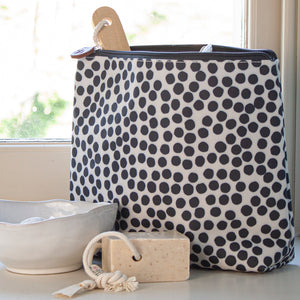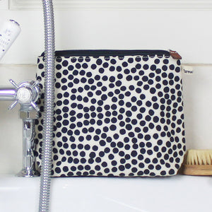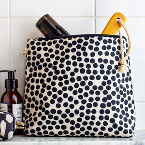 a tall, wide, wash bag, perfect for those taller bottles, in our unique black/off-white hand-drawn random spot design, designed by us in our surrey studio.