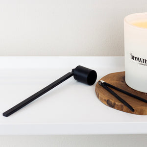 This is a must-have tool for all candle lovers.  Invest in a candle wick snuffer to extinguish your candle, much better than sending debris from the wick, and possibly wax, across the table as you blow out your candle. This one comes in a matte black coated metal and feels nice and weighty in use.