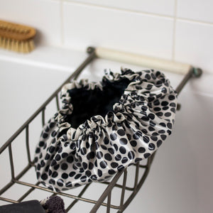 a smart and lightweight shower cap, in our best selling black/off-white, hand-drawn spotty print, designed by us in surrey. this shower cap has a contrast edge printed in our wave design.