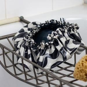 a smart and lightweight shower cap, in our contemporary black/off-white, hand-drawn wave print, designed by us in surrey. this shower cap has a contrast edge printed in our spot design.