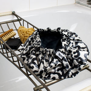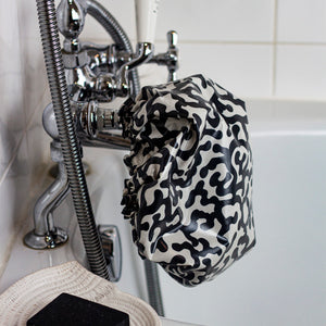 a smart and lightweight shower cap, in our unique black/off-white, hand-drawn coral reef print,designed by us in surrey and inspired by some snorkelling in the Indian Ocean, this shower cap has a contrast edge printed in our rock pool design.
