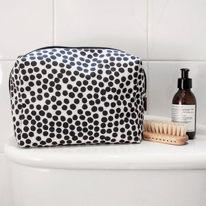 this is a more spacious version of our box-shaped cosmetics bag, and should accommodate a lot of bottles and tubes for a longer holiday, it also has a useful inside pocket for all those items which often get lost at the bottom of the bag. this unique hand-drawn black/off-white random spot print is designed by us in our surrey studio.