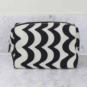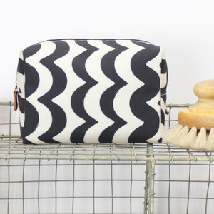A roomy box shaped cosmetics bag, perfectly sized for a weekend away, in our unique black/off-white wave design.